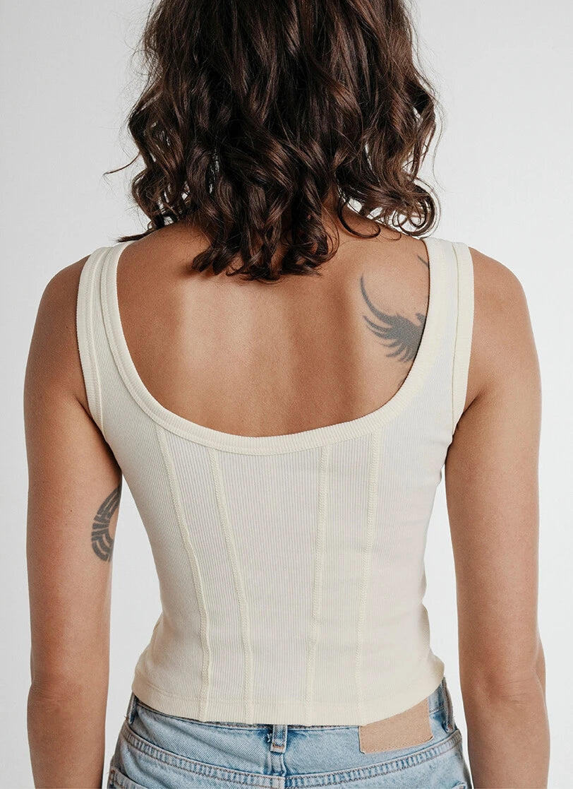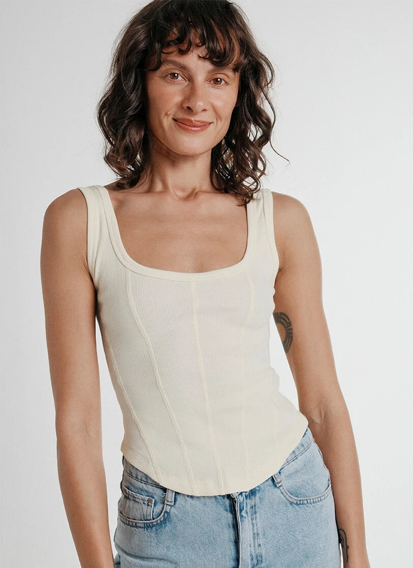 Ženska majica u bodi formi sa tankim bretelama izrađena od rebraste pamučne tkanine sa elastinom. Model lepo prijanja uz telo i pruža stabilnost tokom nošenja, dok minimalistički dizajn omogućava lako kombinovanje uz različite stilove.Visina modela je 175cm, model nosi veličinu 38.